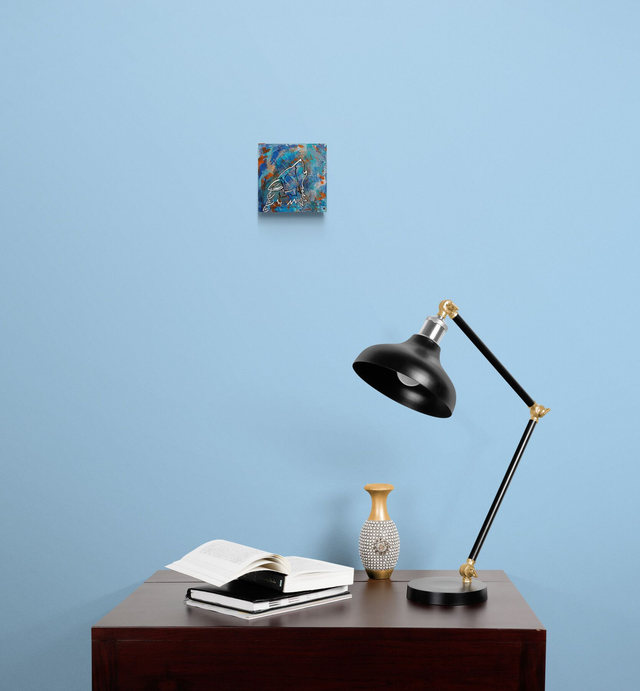Description : LOUP est une création à l’acrylique, réalisée pour le fond au couteau et pour le portrait animalier d’un loup avec des crayons à peinture POSCA. Ce loup hurlant à la lune, est un souvenir des contes de notre enfance. Dans ce mini tableau, le fond est bleu et orange avec de l’argenté et les traits de la tête du loup sont dessinés comme un tag en blanc et noir.