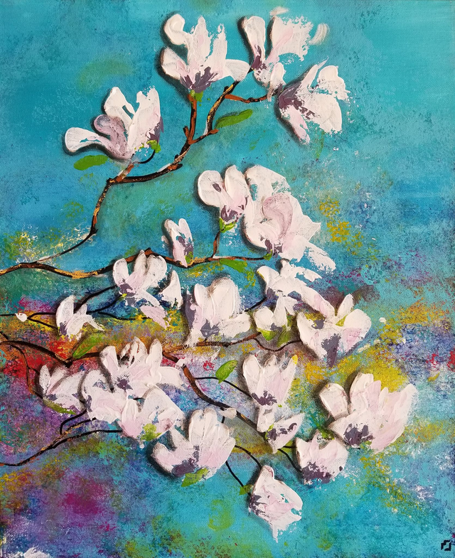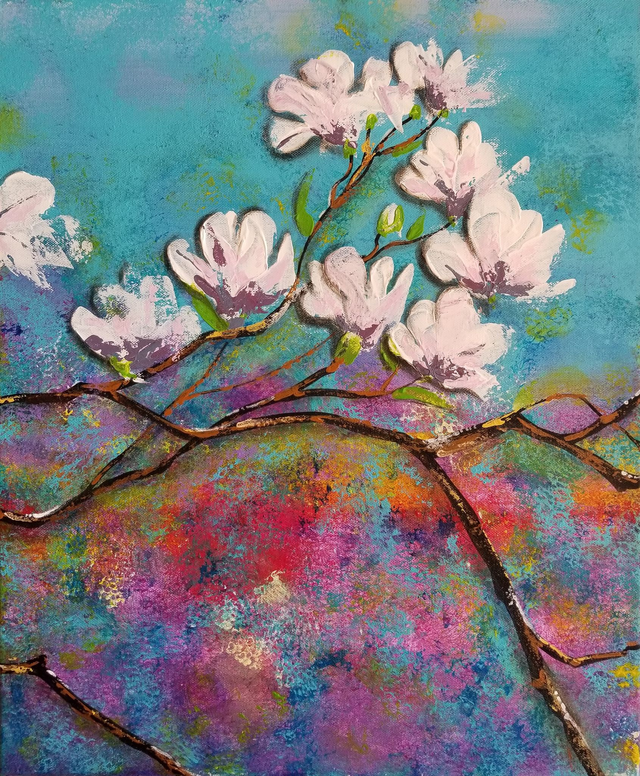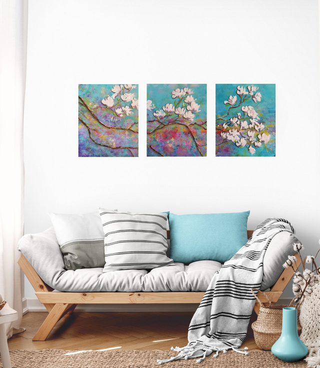 Description : "Magnolia forever" est un triptyque composé de 3 toiles représentant des branches de magnolia fleuries qui s'étalent en longueur. Le fond est à dominante bleu-violet mais des touches de vert, jaune, et rouge crée une ambiance agréable et douce qui ornera les murs de votre maison avec élégance.
