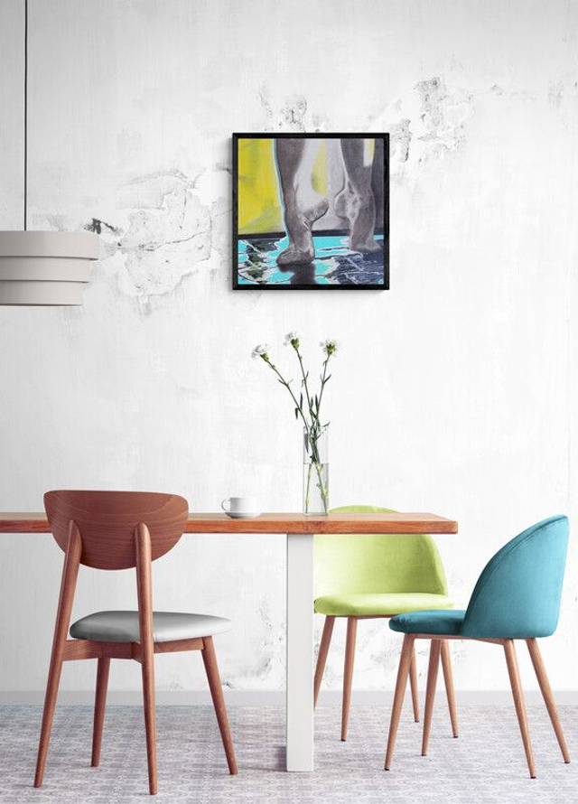 Description : SUR LA POINTE DES PIEDS est un tableau réalisé en technique mixte alliant le fusain et l’acrylique. Il représente deux pieds qui marchent sur leurs pointes, comme un petit pas de danse. Les lattes du parquet font penser à du papier à musique. C’est pourquoi, j’ai voulu : Mélanger la douceur du fusain et la puissance de l’acrylique, mais sur la pointe des pieds.