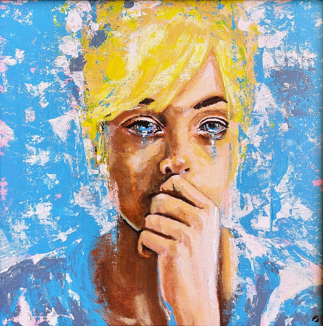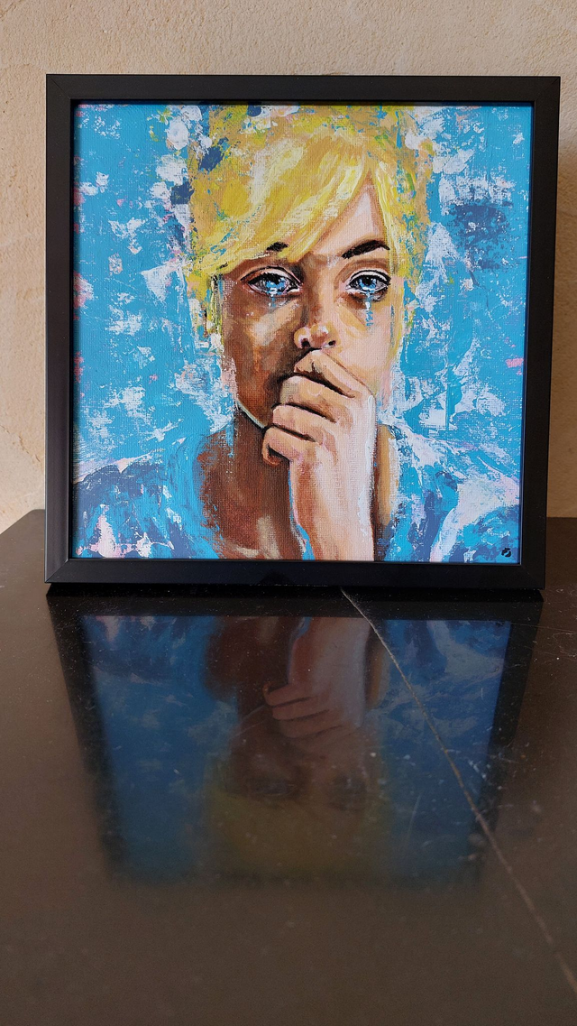 Description : Découvrez « TRISTESSE », une toile unique qui représente de façon figurative une jeune femme, avec la main sur sa bouche et ses yeux remplis de larmes qui s’écoulent sur ses joues. Le fond traité au couteau à peinture, crée une ambiance floue, comme ce que l’on voit à travers nos larmes. Ce tableau nous renvoie à la fois à l’hypersensibilité et à la gestion de nos émotions.