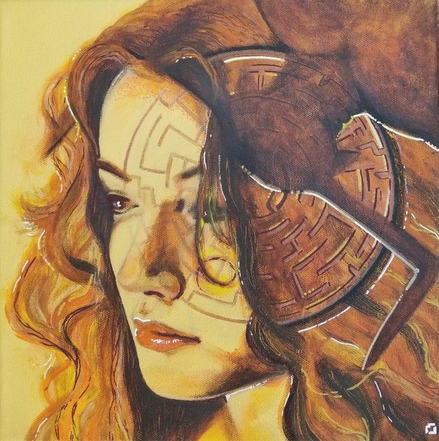 Description : Dans la collection mes « Petites histoires », je peins sur une toile un livre, comme une page de couverture. « ARIANE » représente la princesse grecque de la Mythologie, qui fournit un fil spécial, au héros Thésée pour qu’il puisse sortir du Labyrinthe après avoir tué le Minotaure, un monstre à tête de taureau.