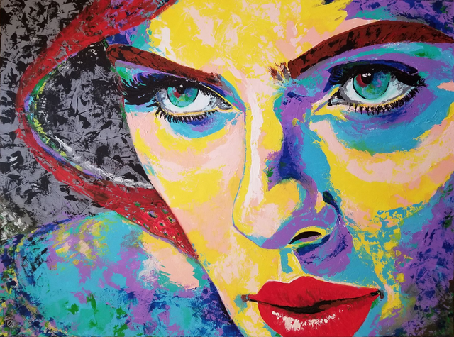 Description : « DESIR » représente le portrait figuratif d’une femme fatale aux lèvres rouges. Mais ses couleurs vives et la composition du visage sous forme de tâches peintes à la peinture acrylique, au couteau en font résolument une œuvre contemporaine et atypique.